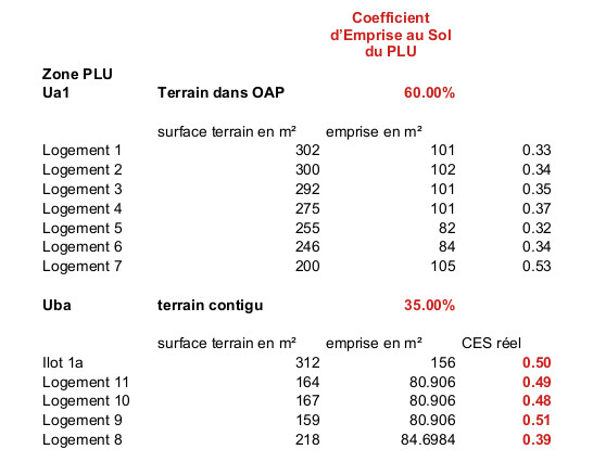 Ce qui est surprenant, c’est que les coefficients d’emprise au sol de la partie hors OAP ne sont pas conformes au coefficient maximum autorisé par le PLU (35%) alors que la partie dans l'OAP, elle, est conforme au coefficeint maximum autorisé (60%). La partie hors OAP est donc plus dense que la partie incluse dans l'OAP!